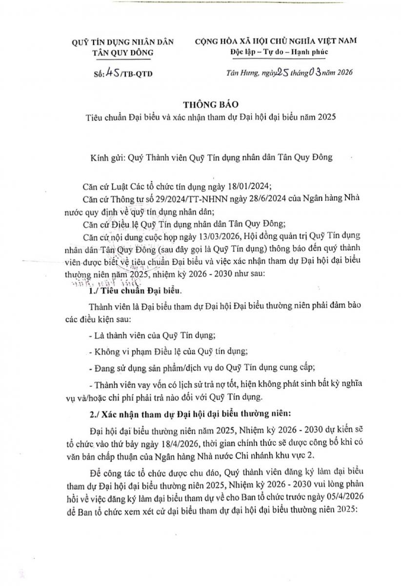 Quỹ Tín dụng nhân dân Tân Quy Đông thông báo sửa đổi, bổ sung Giấy phép hoạt động